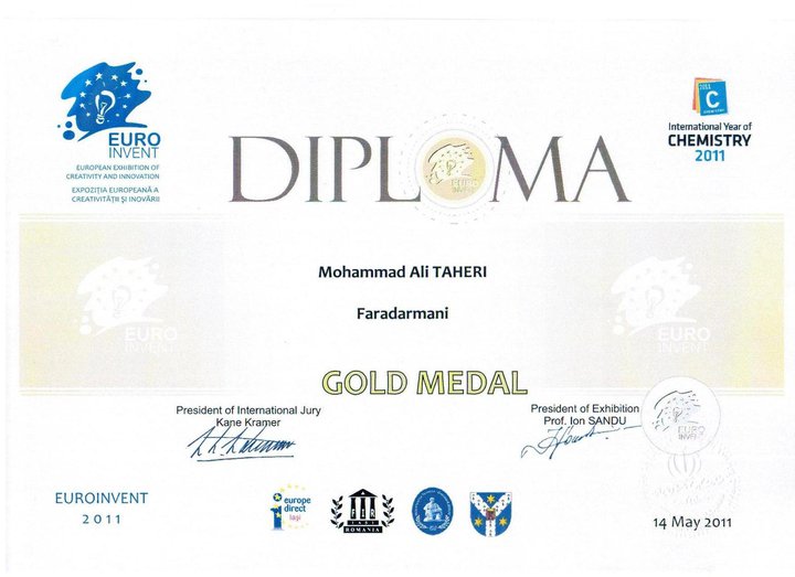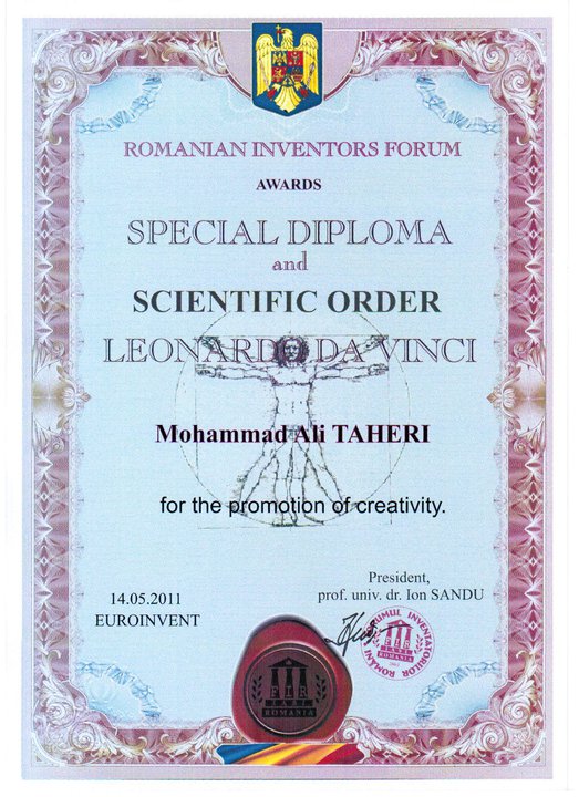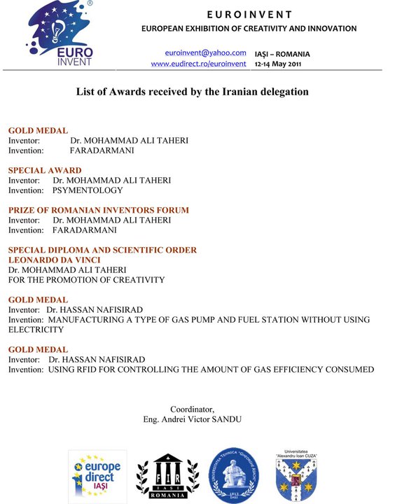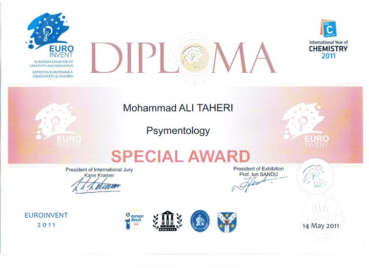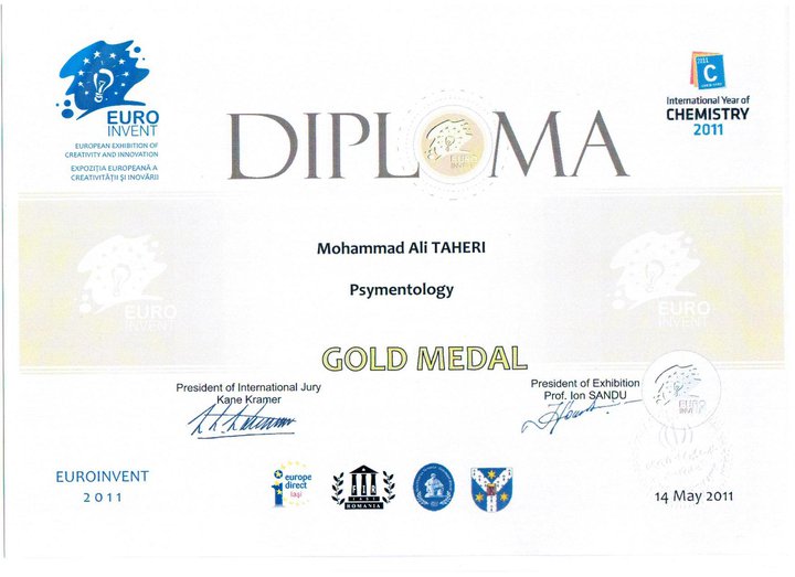 6- Gold Cup from Belgium & International Trade Fair for Technological Innovation in Brussels' International Eureka Contest For founding Iranian Complementary and Alternative Medicines of "Faradarmani" and "Psymentology".7- Gold Cup from Belgium & International Trade Fair for Technological Innovation in Brussels' International Eureka Contest For founding Iranian Complementary and Alternative Medicines of "Faradarmani" and "Psymentology".8- European Innovation Award and "Officer" Degree from Belgium Brussels' Innova (European Innovation World Exhibition on inventors, research and new technologies) For founding Iranian Alternative and Complementary Medicines; "Faradarmani" and "Psymentology"