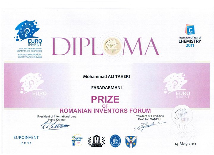 11- Special AIA Award by Asia Invention Association in 2010 International Cyber Genius Inventor Fair (CIGIF 2010) in South Korea For founding the Iranian complementary and alternative medicines of "Faradarmani" and "Psymentology".